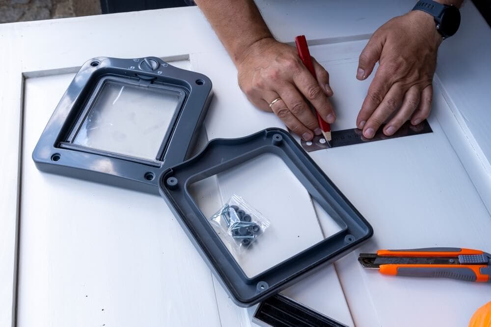 Plasser katteluken på døren der du vil montere den, og bruk den som mal for å markere hvor du skal skjære. Tegn rundt luken med en blyant.
